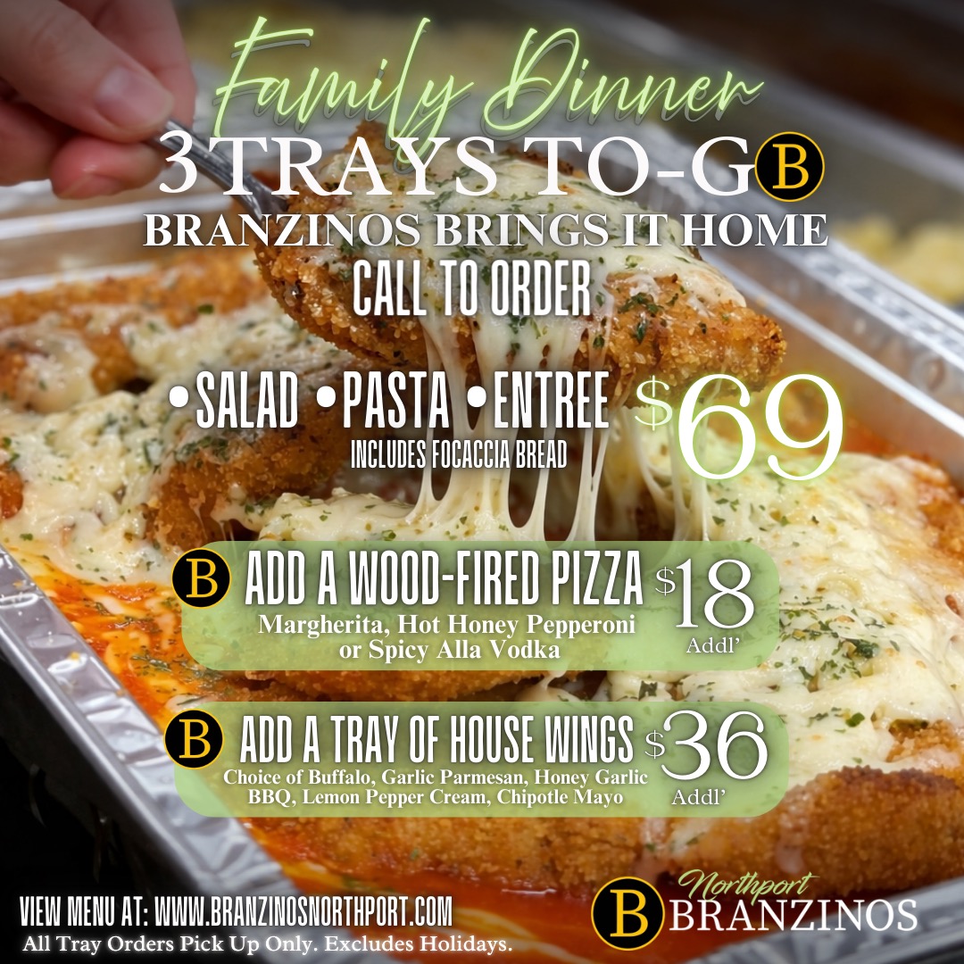 “At our newest Northport location, Branzinos Restaurant & Bar showcases weekly chef-curated specials crafted with locally sourced ingredients. Each week, our culinary team highlights the best of Long Island’s seasonal dishes that complement our fresh seafood, premium steaks, authentic pastas, homemade pizza, gourmet salads and signature sushi. Our weekly specials invite guests to discover something new with every visit while celebrating the vibrant flavors of our community.” Ask us about our gluten-free & vegetarian options. We have something for everyone.